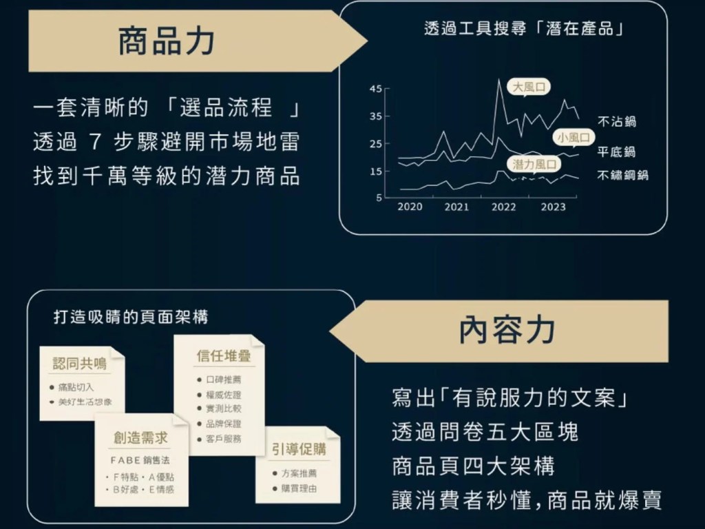 至於這堂課程的廣告影片、銷售頁,算是清晰工整。特別有記憶點的就是第20秒的時候的反轉:「大家迷思是先決定商品再找到買家,實際是先找到買家再決定商品」