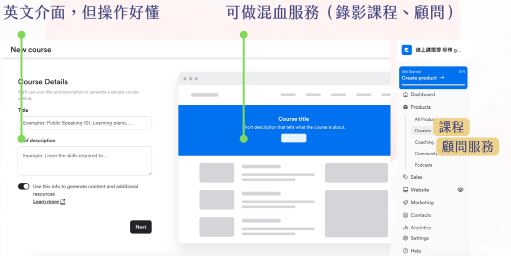 和Kajabi類似,銷售功能、講師介面、學生介面都表現出色。