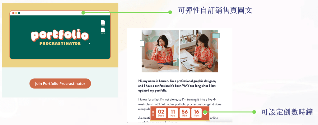 銷售方面,Kajabi可以自己上傳圖文做銷售頁,圖文配置也相當自由,銷售彈性自由。