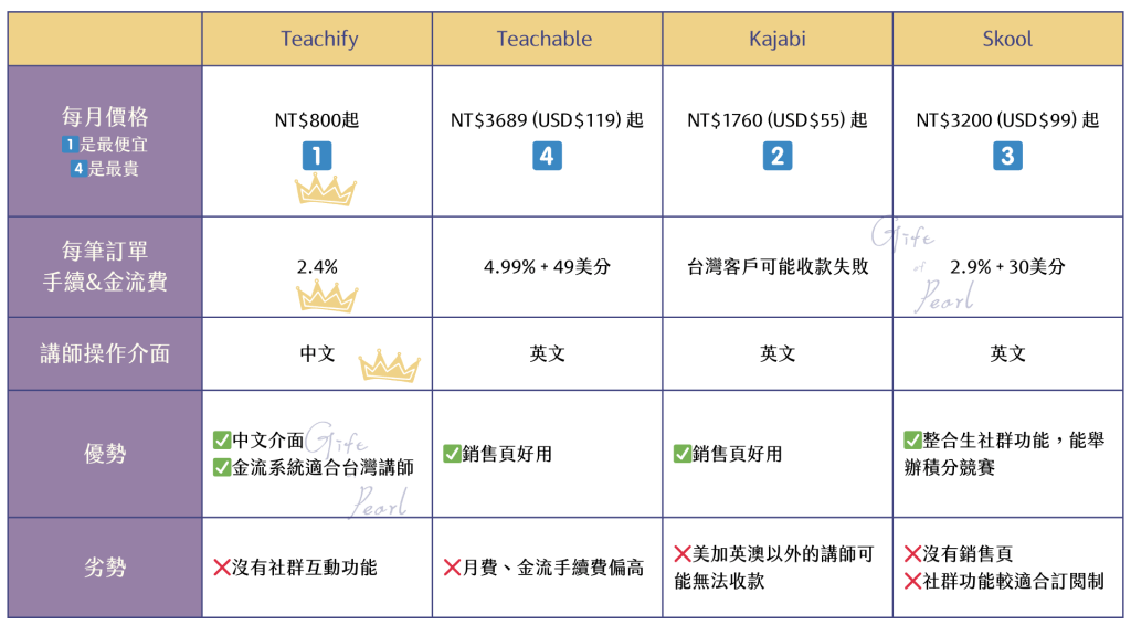 系統商國內外則有幾個選擇:你可以用Wordpress自己架官網,也可以付月費使用Kajabi、Skool、Teachible、Teachify等專為線上課設計的系統。