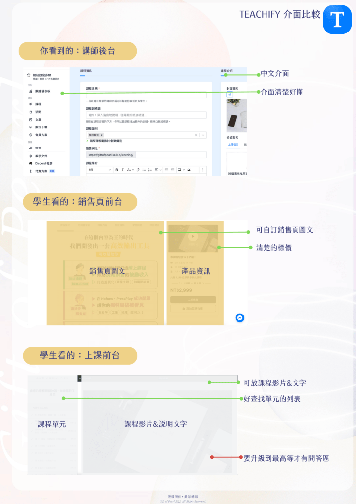 另一方面Teachify是中文介面,這也是他的最大優勢,客服可以用中文溝通,像Kajabi、Skool都是要用英文跟客服溝通的,基本的銷售頁、學生介面、講師介面也都有。